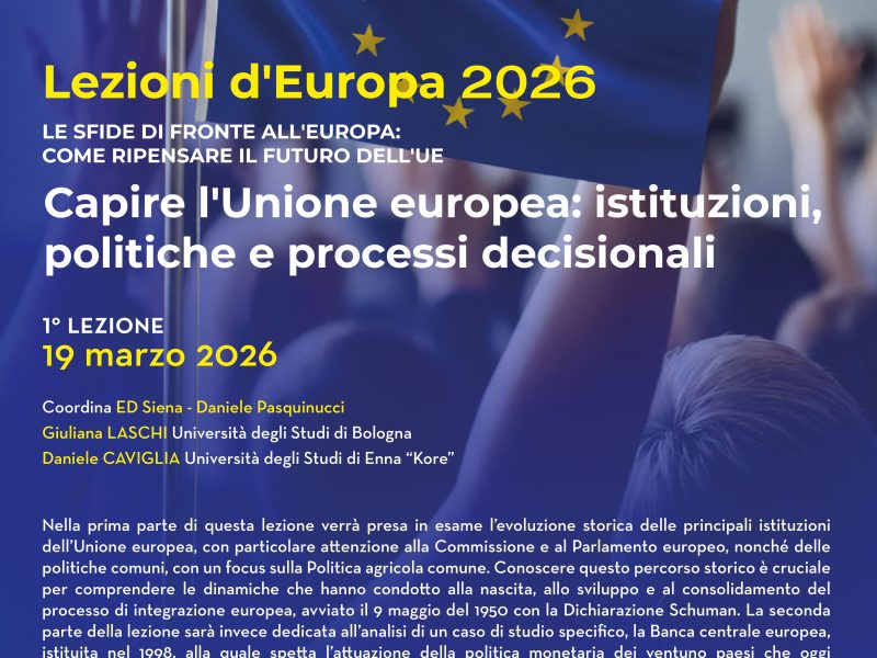 Ciclo di Webinar “Lezioni d’Europa 2026” Dal 19 marzo al 14 maggio 2026 il Centro Europe Direct Chieti organizza “Lezioni d’Europa”, un ciclo di otto