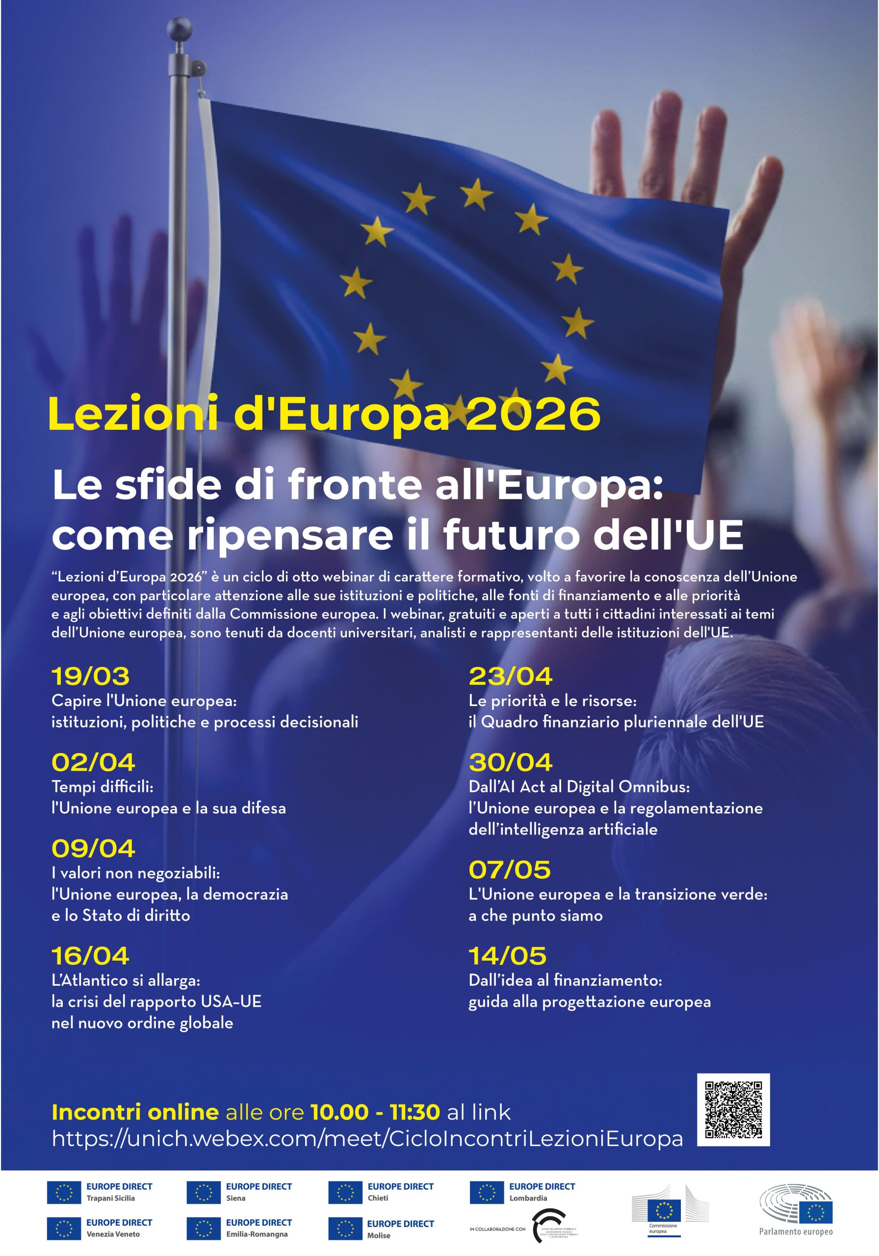 Dal 19 marzo al 14 maggio 2026 il Centro Europe Direct Chieti organizza “Lezioni d’Europa”, un ciclo di otto webinar di carattere formativo, dal titolo “Le Sfide di fronte all’Europa: come ripensare il futuro dell’UE”, in collaborazione con altri centri della Rete nazionale Europe Direct come: Europe Direct Siena, Europe Direct Trapani Sicilia, Europe Direct Venezia Veneto, Europe Direct Emilia-Romagna, Europe Direct Lombardia e Europe Direct Molise.