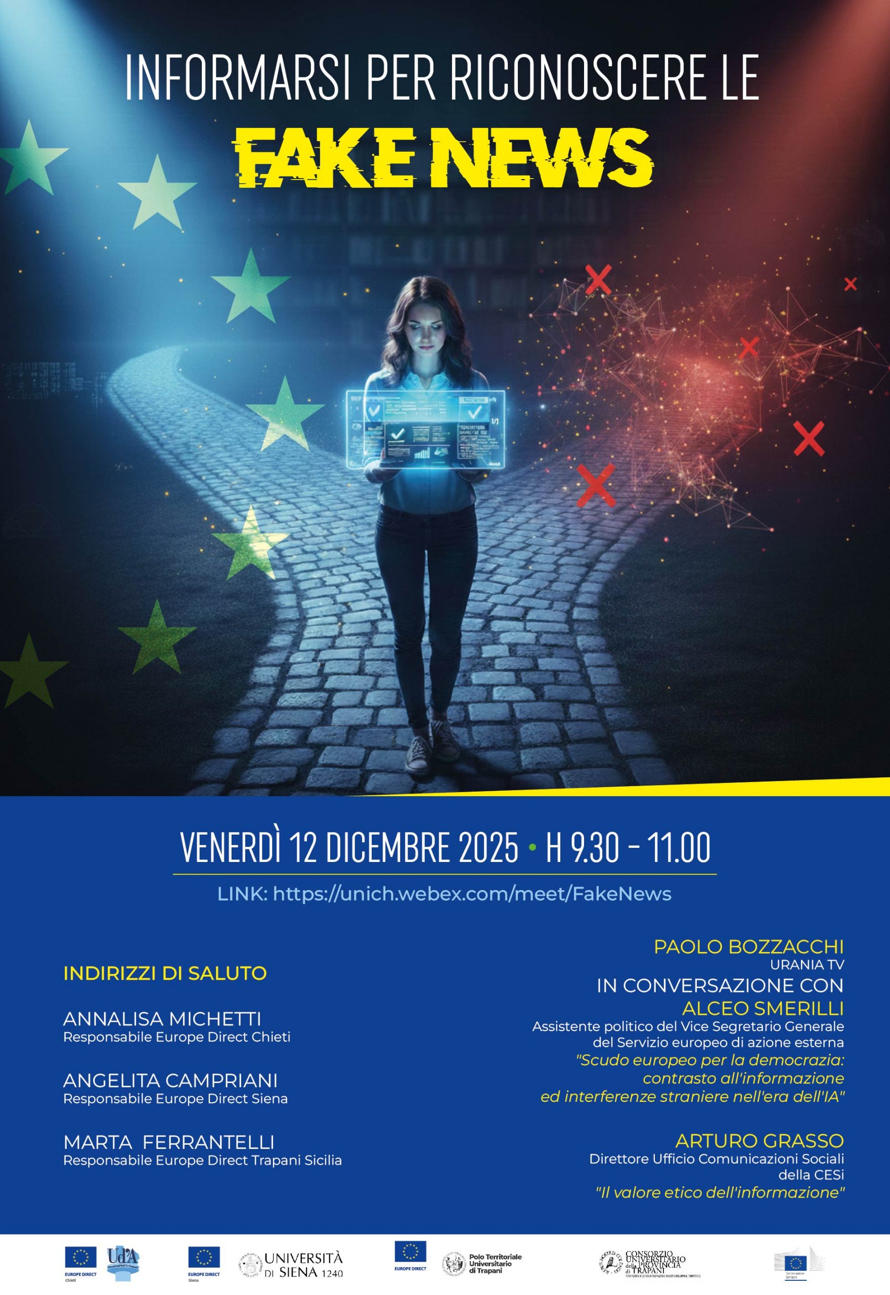 ll webinar per contrastare la disinformazione in Europa, organizzato dalla Rete costituita dai centri d’informazione Chieti, Siena e Trapani Sicilia, sarà realizzato il 12 dicembre 2025, dalle ore 9:30, per comprendere il diritto delle persone a un’informazione corretta, imparziale e utile.