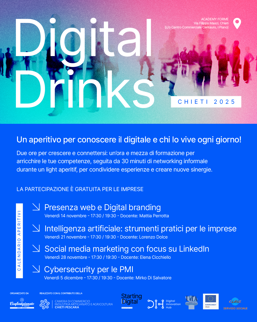 Nascono i Digital Drinks di Confartigianato Imprese Chieti L’Aquila e Starting Digital – Innovation Hub, in collaborazione con il centro Europe Direct Chieti e con il contributo della Camera di Commercio Chieti Pescara. È un’occasione per approfondire le tematiche digitali più attuali tra laboratori interattivi e momenti conviviali per creare relazioni e confronti.